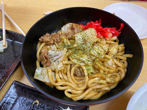 そして、欲望を一番満たしてくれたのはこちら、焼きうどん(550円)。うどん1玉分の焼きうどんに満たされました! 味付けが絶妙なんです。濃すぎない、でもビールに合う。流石の老舗大衆居酒屋です。