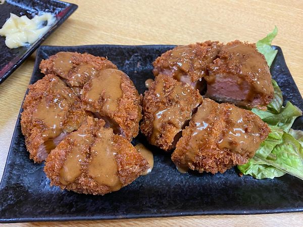 欲望を満たすべく、ハムカツ(440円)。注文してから料理が来るまで、どんなハムカツかなって想像してたんですが、想像を遥かに超える分厚いハムでできたハムカツでした。まさにお中元のハム!盛り上がりました。