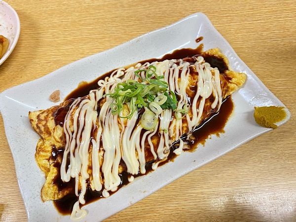 とん平焼き(490円)。マヨネーズとソースたっぷりに辛子!欲望を満たしてくれるお料理です。
