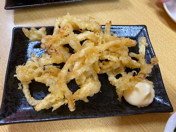 するめの天ぷら(440円)。甘味のあるするめの天ぷら。マヨネーズに一味をたっぷりかけて頂きました。