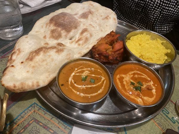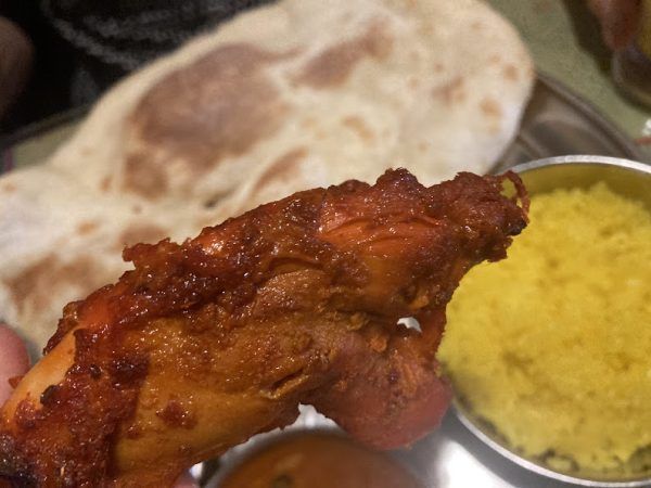 次にやって着たのがこちら、ランチスペシャルのAセット!ついているのは2種類のカレーとナン、ミニライス、タンドリーチキンです。カレーは日替わりカレーにもう一品は好きなものを選べます。この日は豆カレーが日替わりカレーで、もう一つはバターチキンを選んでみました。