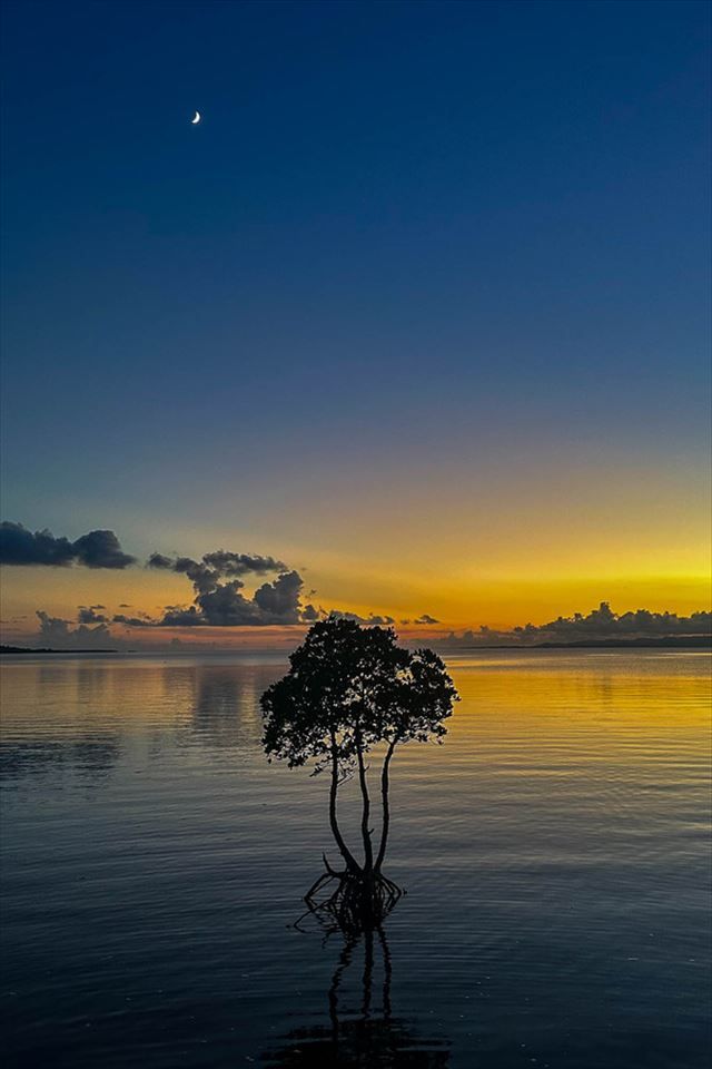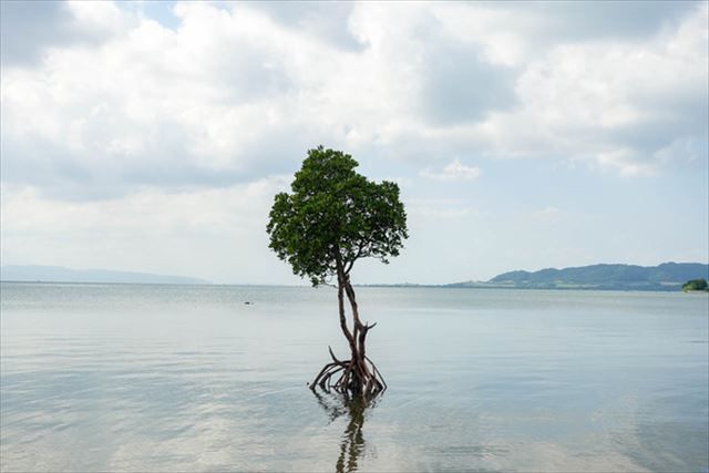 川平方面から市街地に戻る道中、立ち寄ってほしいのが有名観光スポット「一本マングローブ」。マングローブといえば鬱そうと群生しているイメージですが、このマングローブは海にポツンと1本のみ。