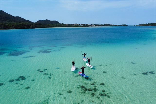 世界的にも有名な石垣島を代表する観光スポット「川平湾」では、ハワイ生まれの水上アクティビティ・SUPが体験可能! 地元のマリンショップ「RUANOA」で申し込みをすると、体験中の様子をドローンで撮影してくれます。川平湾の絶景を背景にした写真は一生の思い出となるはず。
