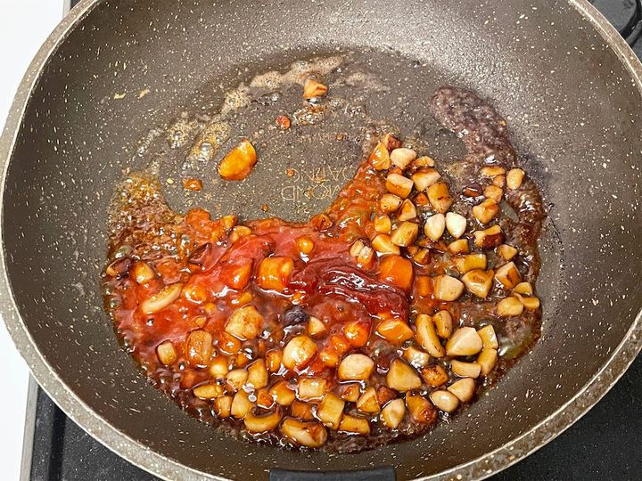 カリッとしたら、焼肉のたれ、コチュジャン、ケチャップ、砂糖を入れて絡めます。