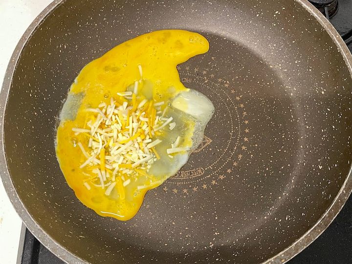 1.  フライパンを中火で熱し、バター、溶き卵、ピザ用チーズを入れて、スクランブルエッグを作ります。