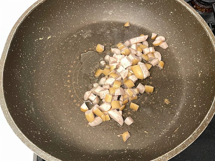 2.  フライパンにサラダ油を引き、ウインナーを炒めます。