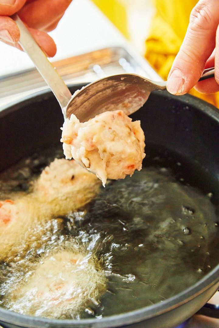 揚げ油を低めの中温(170℃。乾いた菜箸の先を鍋底に当てると、細かい泡がシュワシュワッとまっすぐ出る程度)に熱し、(1)のたねの1/8量くらいをスプーンですくってもう一本のスプーンで丸く形を整え、そっと落とし入れる。残りのたねも同様にし、ときどき返しながら3~4分揚げる。全体がきつね色になったら取り出し、油をきる。