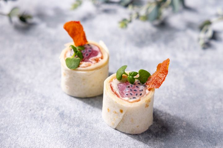 カプレーゼをイメージしたセイボリー。桃のコンポート、リコッタ&クリームチーズ、生ハムをトルティーヤ生地で巻いています。隠し味にはバジルシードを加えて。甘みと塩味、そしてチーズのコクのハーモニーを堪能できます。
