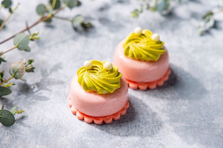 中にしのばせたストロベリーゼリーと、トッピングのピスタチオクリームが豊かな風味をプラス。ムースにはすっきりとした風味の小さな桃「ペッシュ・ドゥ・ヴィーニュ」を使用し、甘みとさわやかさの絶妙なバランスを実現します。