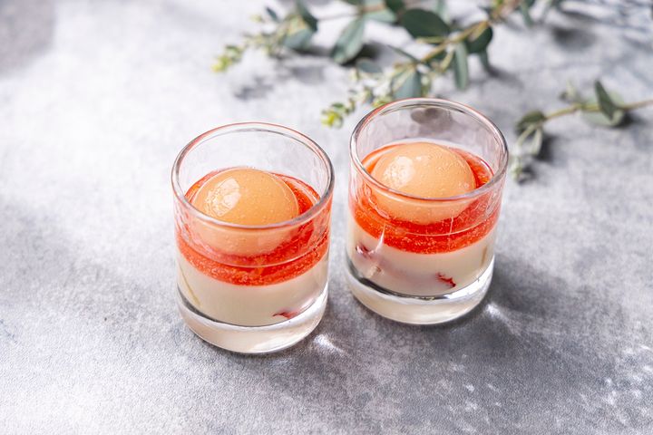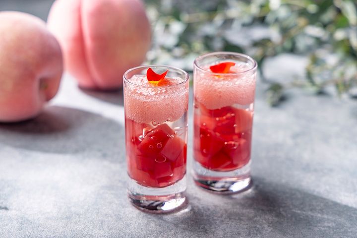 桃の果肉をクランベリーのシロップでコンポートし、マスカットゼリーと合わせていただきます。トップにのせたライチの泡が甘くさわやかな風味を引き立たせます。