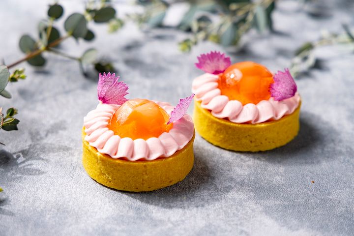 夏に咲き誇るヒマワリをイメージ。レモン風味のタルトの中にココナッツのガナッシュを入れ、カットした桃を閉じ込めたドーム型のエルダーフラワーゼリーをトッピングしています。