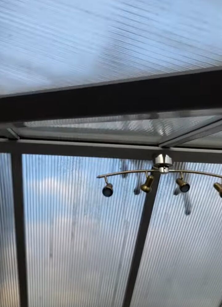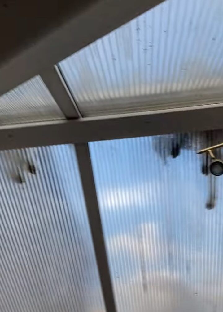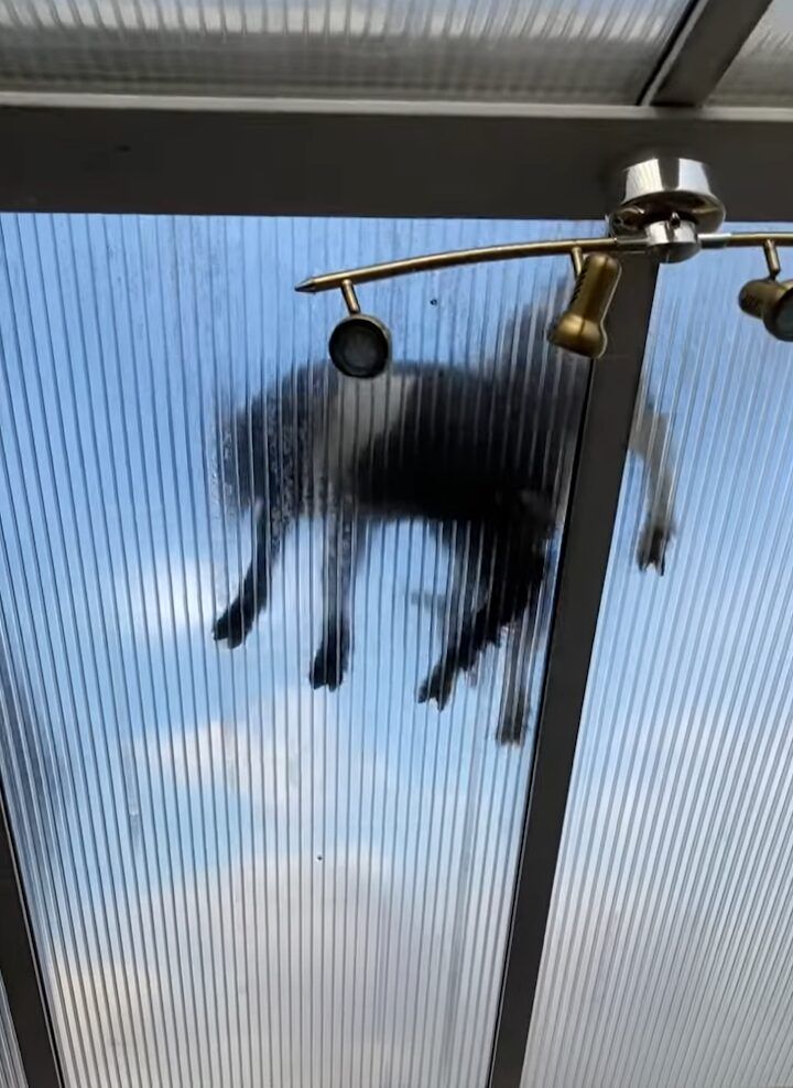 温室の中からカメラをまわす撮影者さん。 何かコツコツと足音がしていますが・・・、どうやら温室の屋根の上を歩いている動物がいるみたいです。