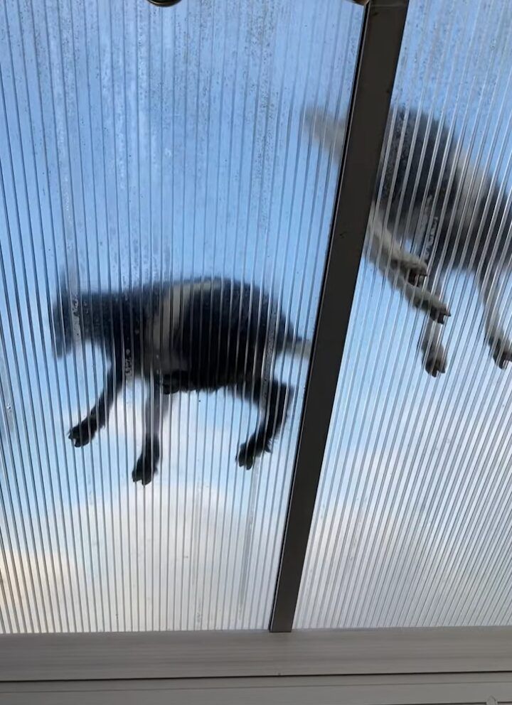 温室の屋根を歩くコツコツという足音。 屋根の上で、どうやら動物が遊んでいるようですが・・・。