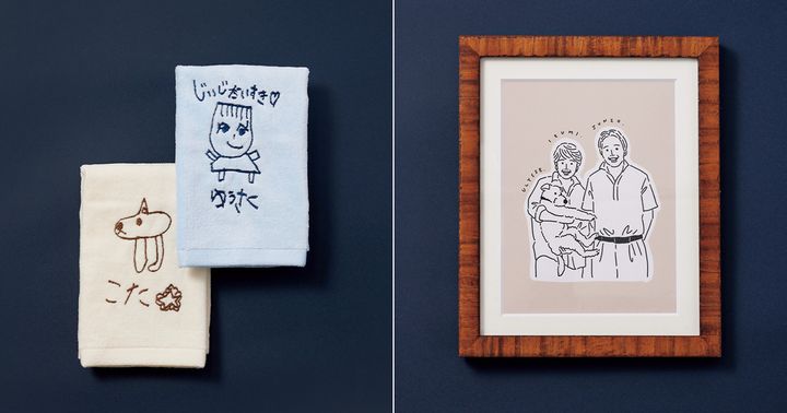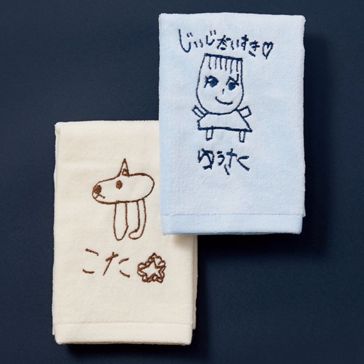 じいじを初めて描いたイラストをそのままタオルに。自分の絵が形になって、子どもも大喜びでプレゼント。イラストの高い再現性はもちろん、上質なUCHINOのタオルは年配世代の信頼感も抜群。子どもの絵の成長記録として、思わず自分用にもオーダー。(伊東志織さん)
