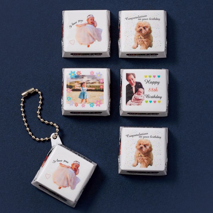 二次会の引き菓子などでお馴染みのオリジナルチロルチョコを、孫と飼い犬の写真で両親に作ってプレゼント。さらに形に残したかった包装紙は、専用キットでチロルチョコ型のキーホルダーにカスタムして渡したら可愛い!と喜んでくれました。(小川小百合さん)