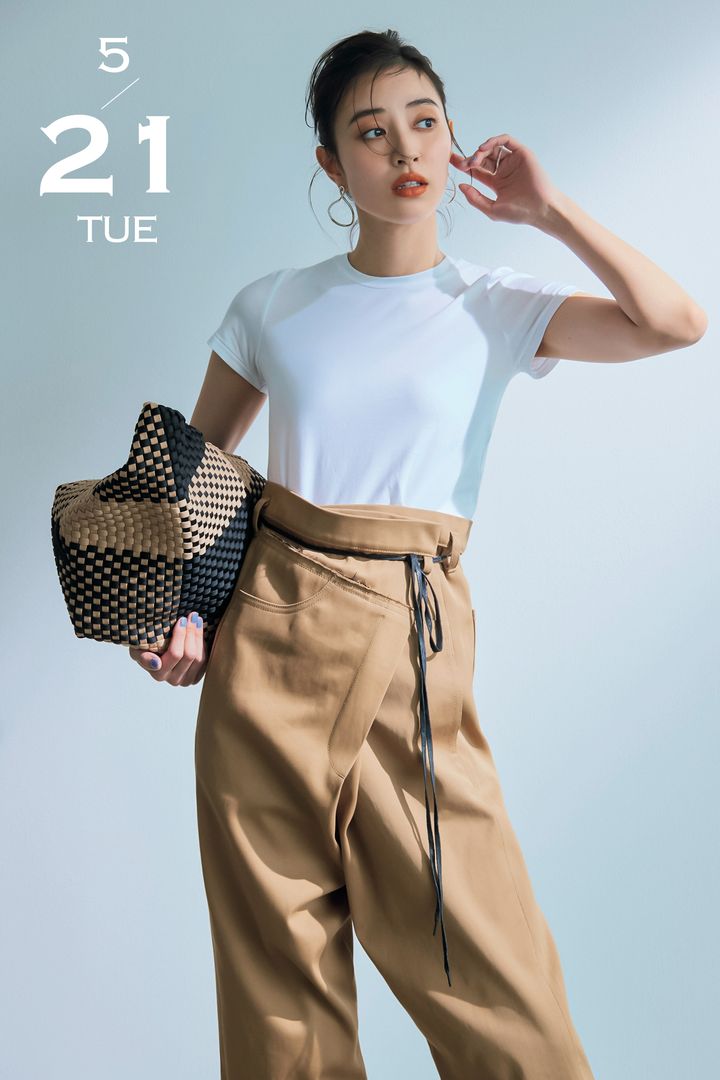 カットソー[2枚セット]¥6,600(ヘインズ フォー ビオトープ) パンツ[紐ベルト付き]¥64,900(リトコフスカ フォー ビオトープ) ピアス¥55,000(ブランイリス) トートバッグ¥49,500(ナゲティ)