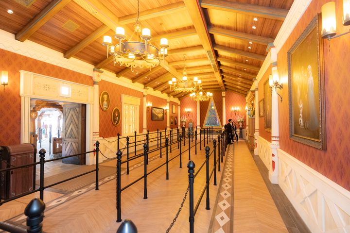 エルサの戴冠式のパーティーが行われた大広間。天井の装飾や奥にある玉座がゴージャス。
