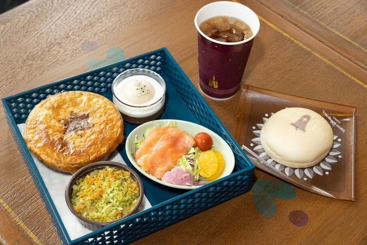 ここでいただけるのは「アレンデールロイヤルセット(ビーフかシーフード)」¥3,500。スモークサーモントラウトとオレンジのサラダ、ポテトグラタン、牛肉のパイ包焼き(またはオマール海老と赤魚のパイ包焼き)、パン、オラフのマシュマロココアムース、ソフトドリンクのチョイス。グラタンはトロールの谷をイメージしているそう。