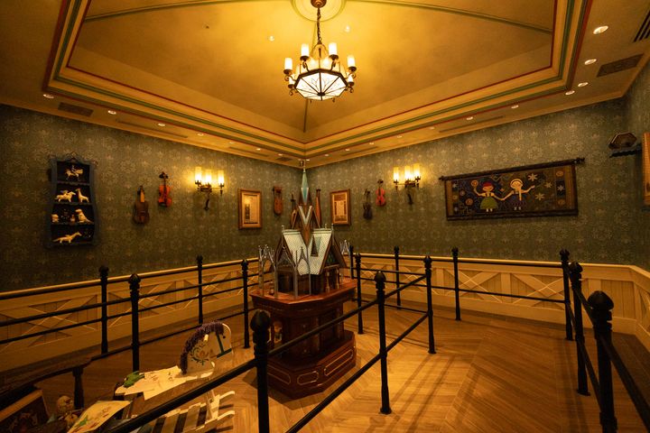 「肖像画ギャラリー」にはアナとエルサの思い出がいっぱい詰まった絵画が。本棚の中をよーく見るとオラフの人形と一緒に「雪だるまの作り方」の本もありましたよ。