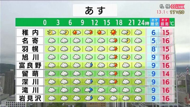 あすも雲が多めで、道央など通り雨があるでしょう。