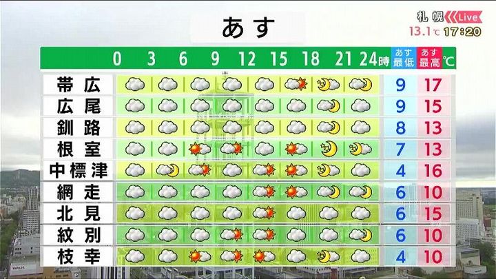 オホーツク海側や根室などでは日のさす時間がありそうです。最低気温は広く6度前後。寒くなりそうです。
