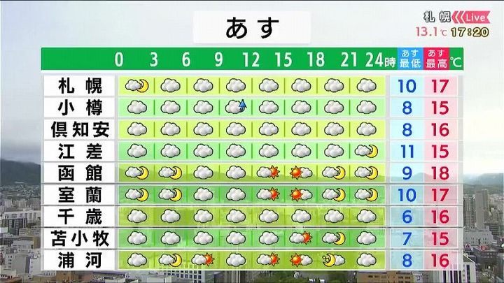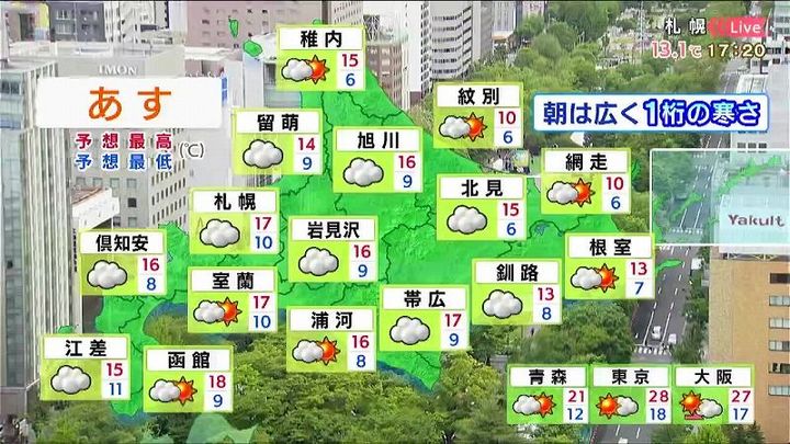 函館や室蘭などで晴れ間もありますが、道央は雲が多く、小樽周辺では午前中に雨が降るでしょう。札幌もぱらつく可能性があります。