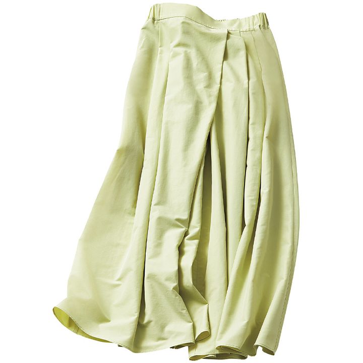 程よいハリとしなやかさのタフタ素材パンツは、たっぷりの生地感とアシンメトリータックで、スカート見えしながら実は足捌き抜群のワイドパンツという嬉しい秘密が。自宅でも洗えるシャカシャカで、お仕事からアクティブシーンまでママの行動範囲を拡張してくれます。 パンツ¥47,300(エブール)