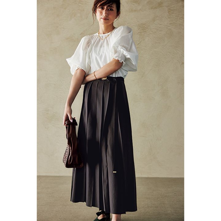 辛口ボトムスとのMIXコーデも鉄板。 スカート¥67,100〈ともにエブール〉フラットシューズ¥61,600バッグ¥86,900〈ともにHEREU〉ネックレス¥97,900ブレスレット¥53,900リング¥52,800〈すべてSapir Bachar〉(すべてエブール)