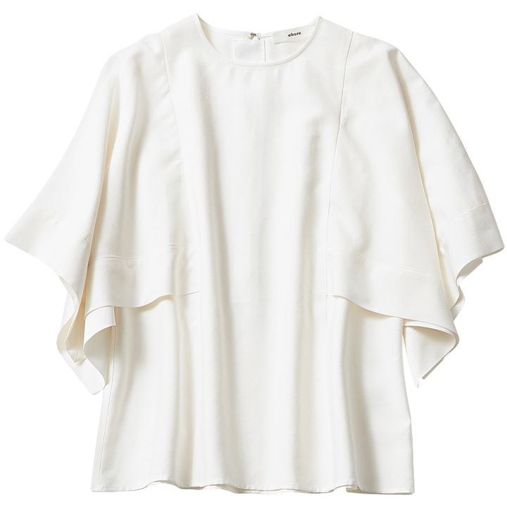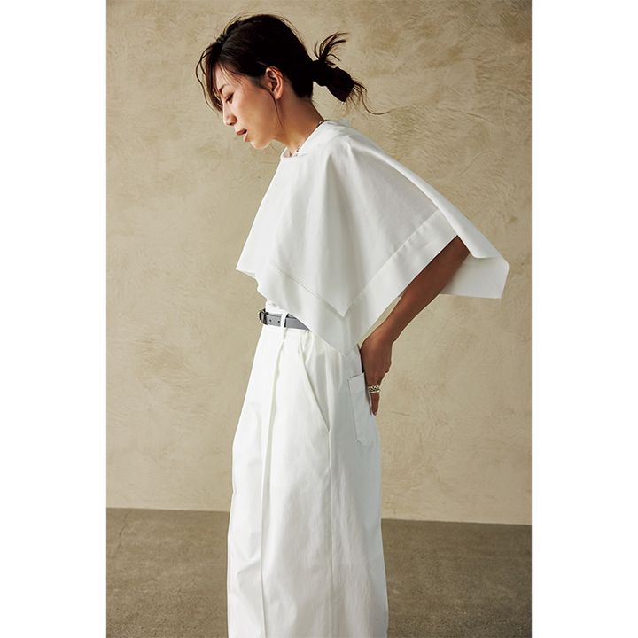 着映える白で洗える、というヘビロテ必至な一枚。サラッとドライタッチなハリのある素材が美しいケープ風のフォルムを演出してくれる。 ブラウス¥39,600(エブール)