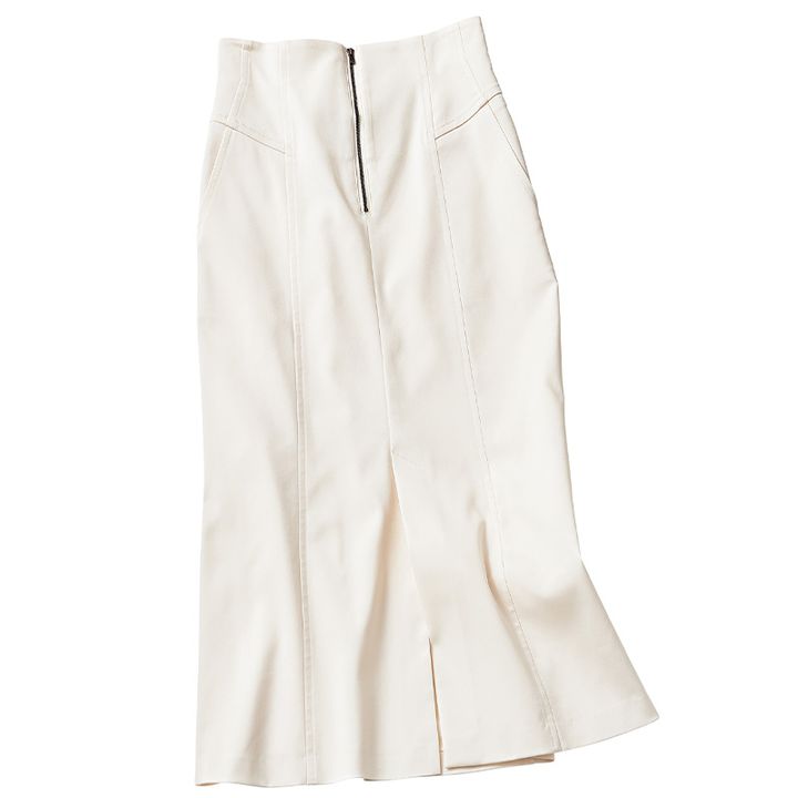 女らしさとモード見えを備えた最旬マーメイドシルエット。ハイパワーストレッチ素材で体のラインを拾いにくく、動きやすさも申し分なし! スカート¥47,300(エブール)