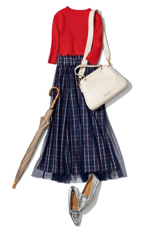 スカート¥14,960/And Couture(And Couture ルミネ新宿店) アンサンブル(ニットのみ着用)¥19,800/アプワイザー・リッシェ 傘¥14,300/トラディショナル ウェザーウェア(トラディショナル ウェザーウェア ルミネ有楽町店) バッグ¥91,300/ジャンニ キアリーニ(ジャンニ キアリーニ 銀座店) ローファー¥18,150/ダイアナ(ダイアナ 銀座本店)