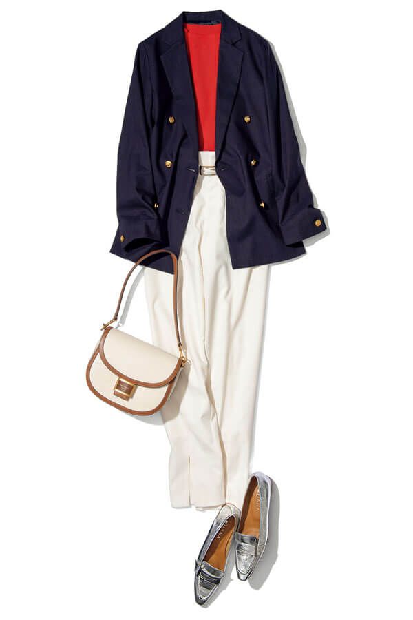 ジャケットにタックパンツ、足元はローファーのプレッピースタイルを、大人の女性らしくアレンジ。ニットの赤と足元のシルバーで華やぎを盛れば、一目置かれるおしゃれ感に。
