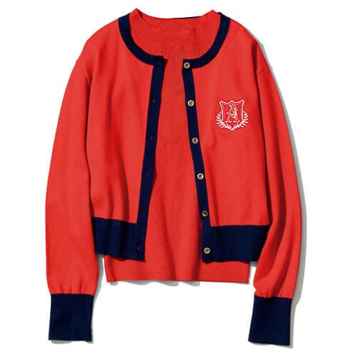 七分袖のリブニットに、エンブレムとパイピングが利いたトラッド調のカーデがセット。グッドガールテイストのデザインなら鮮やか色も知的にまとえます♪