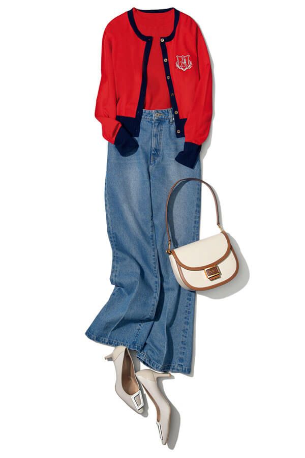 アンサンブル¥19,800/アプワイザー・リッシェ デニムパンツ¥13,970/LILY BROWN バッグ¥64,900/ケイト・スペード ニューヨーク(ケイト・スペード カスタマーサービス) パンプス¥31,900/銀座かねまつ(銀座かねまつ6丁目本店)