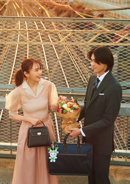 (別府さん)スーツ¥43,890、シャツ¥5,390、タイ¥6,490、バッグ¥14,190/以上ユニバーサルランゲージ(スーツスクエア TOKYO GINZA店) [いろいろ野菜のブーケNO2]¥4,500 問い合わせ先: