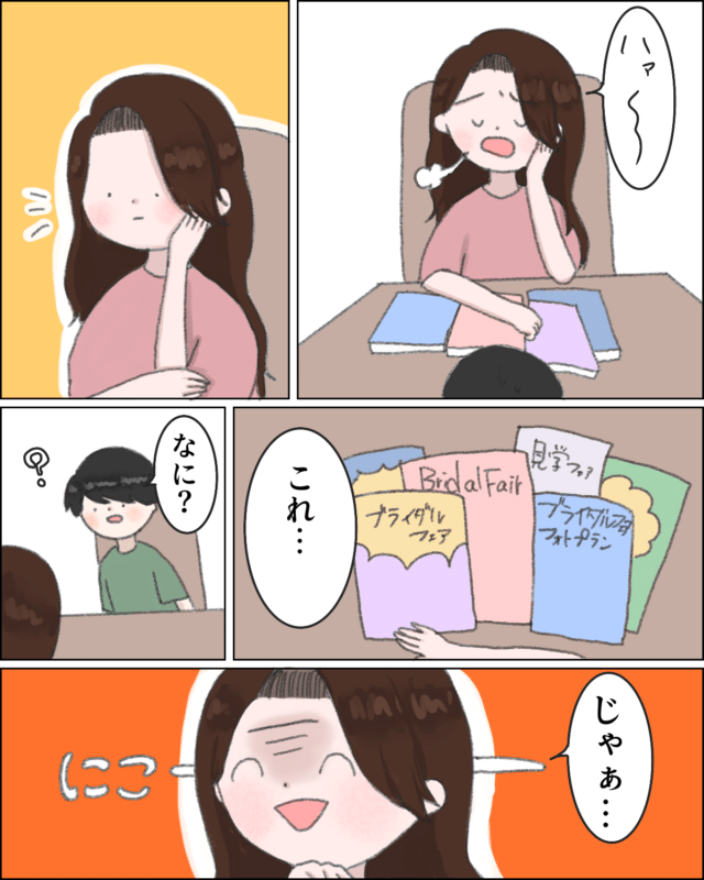 テーブルに広げられたたくさんのブライダルフェアのパンフレットを前に、深いため息をついた優子さんでしたが、ふと何かをひらめいたようです。