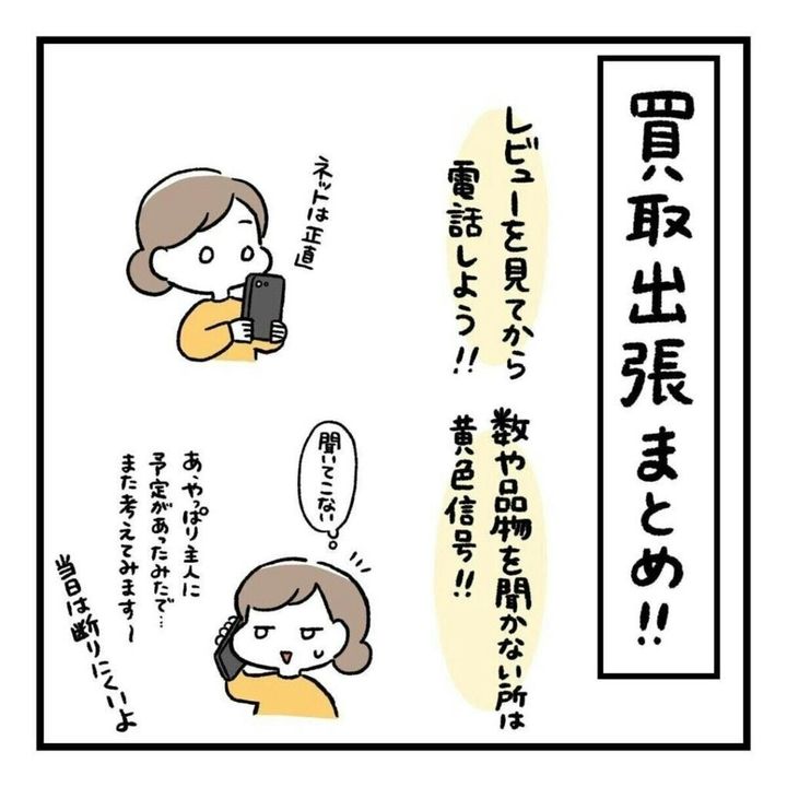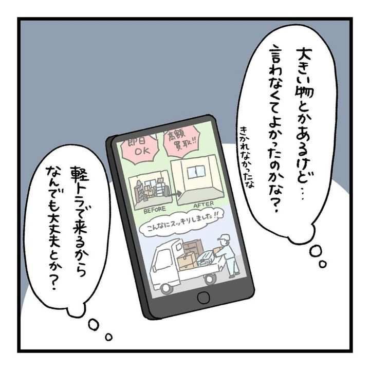 出張買取業者に予約の電話を入れたミワカモさん。電話でのやり取りで、査定希望の個数や大きさなどを全く聞かれなかったため、少し違和感を覚えました。大型家具や家電もあったため、なおさら不安に感じたようです。