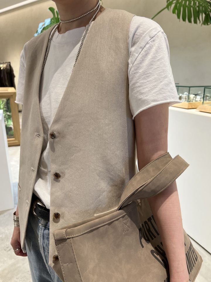 「夏はやっぱりTシャツを着たいのですが、どうしてもシンプルになりがちなので、麻素材のベストを合わせてニュアンスをプラスしました。すっきりとしたベージュがスタイルをクリーンな印象に見せてくれるのでお気に入りです。自分らしくハズしも忘れずに、プリントのバッグを合わせて」