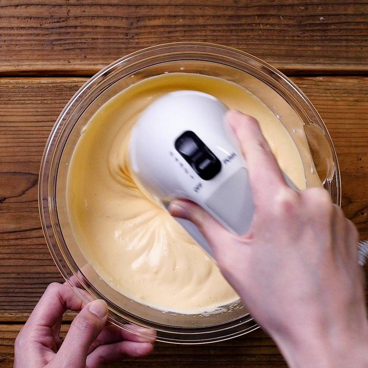 4: 卵黄を加え、ハンドミキサー低速で全体が黄色っぽくなるまで混ぜます。