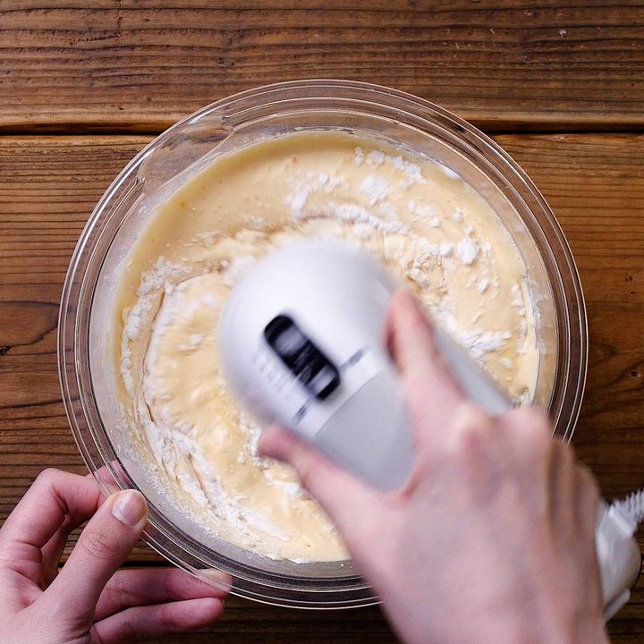 6: 米粉を入れ、ハンドミキサーで粉気がなくなるまで混ぜます。