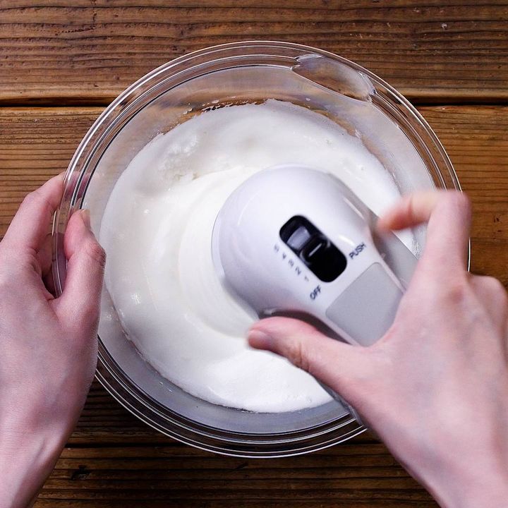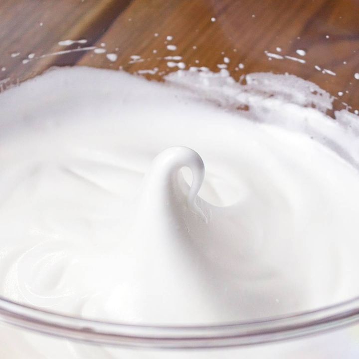 メレンゲは混ぜすぎると分離してしまうので、混ぜすぎないよう気をつけてください。ツノが立ってお辞儀したら手を止めて大丈夫です。