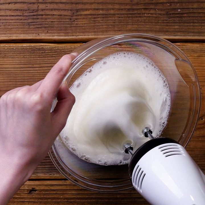 1: ボウルに卵白を入れ、ハンドミキサー低速で軽く泡立てます。