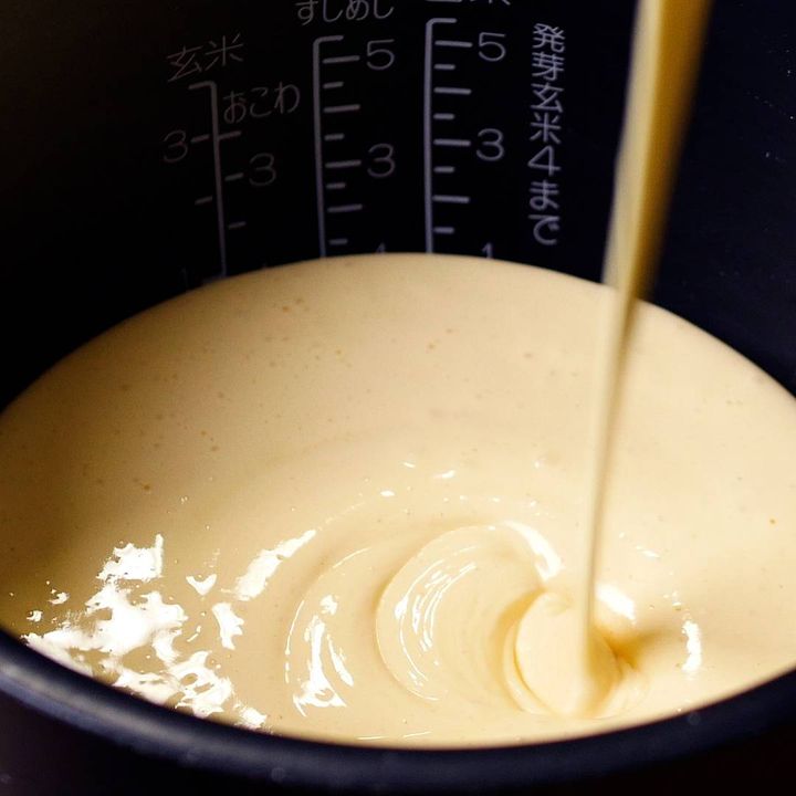 7: 炊飯器の内釜に生地を流し入れ、2〜3回落として空気を抜きます。本体にセットし、ケーキモードで50分炊飯します。