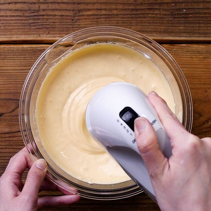 3: 生地を持ち上げた時におじぎするくらいのやわらかさになったら、ハンドミキサーを低速にして1分ほど混ぜ、キメを整えます。