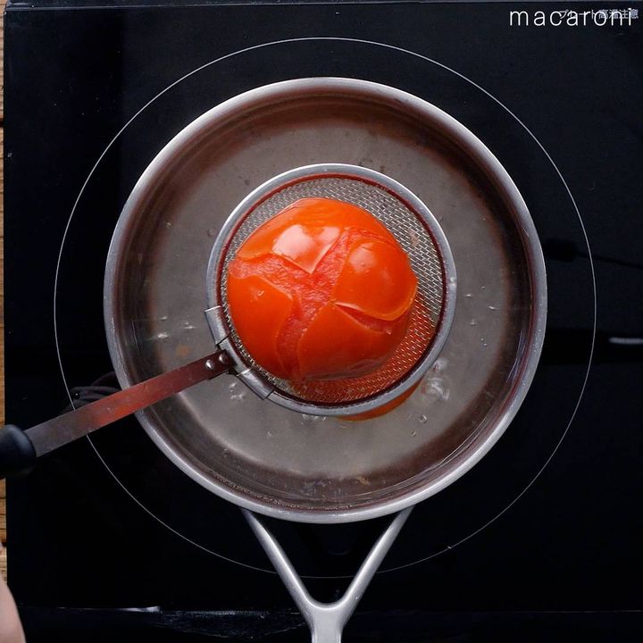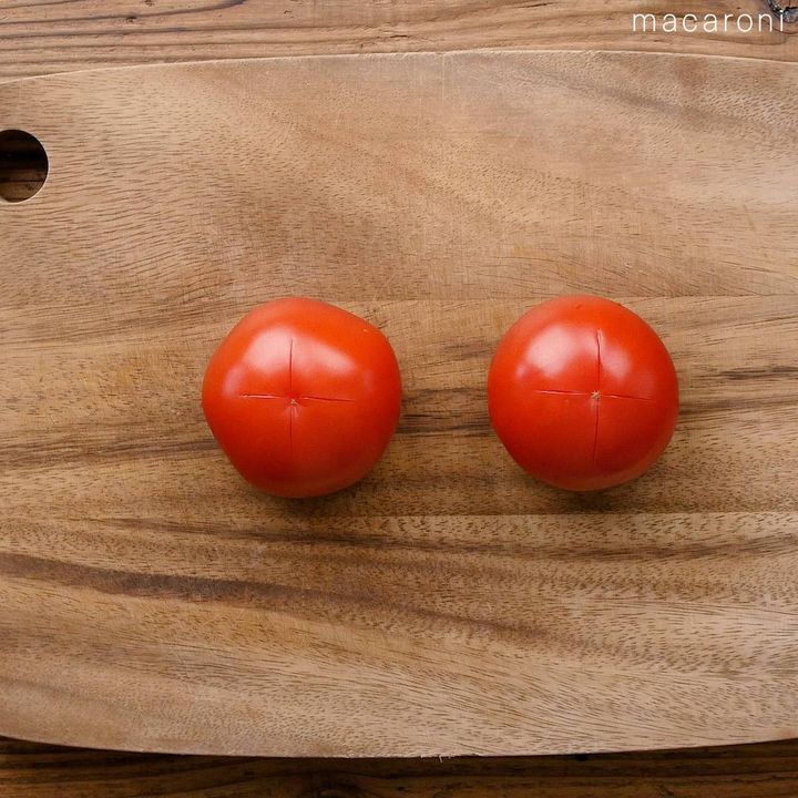 2: 鍋に湯を沸かしてトマトをやさしく入れ、1分ほど加熱します。