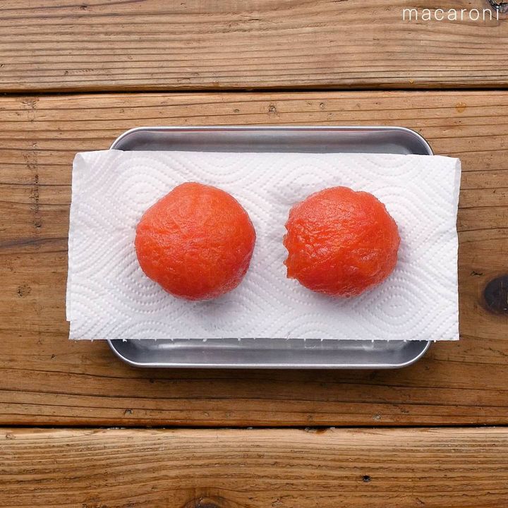 3: 皮がめくれてきたら取り出し、氷水につけて皮をむきます。キッチンペーパーでトマトの水分を拭き取ります。