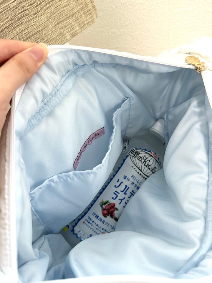 真っ白のナイロン生地のバッグは、ふわふわな触り心地。