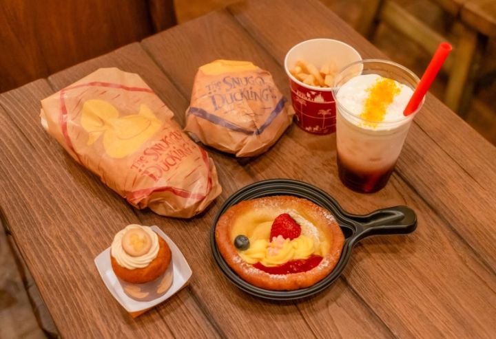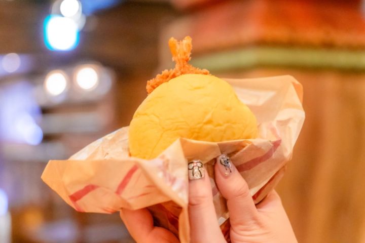 こちらのレストランはメインのハンバーガーの他、ラプンツェルをイメージしたスイーツやドリンク、ダックモチーフのカップケーキなど、メニューが充実しています。大きなフライドシュリンプバーガーは、エビのしっぽが飛び出した見た目がインパクト大!