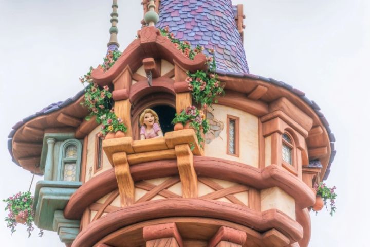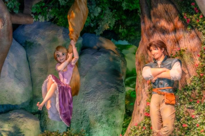 ボートが出発すると、まず最初に塔が登場!ラプンツェルが窓から顔を出していて、楽しそうに歌っています♪まさに映画の中に入り込んだかのような気分になりますね。