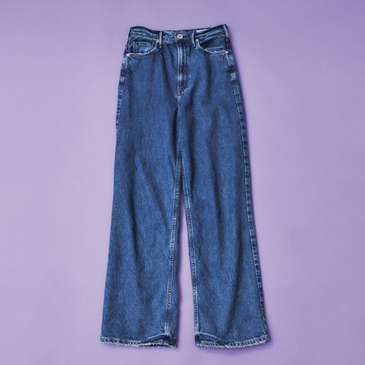 脚長見えするハイライズワイドストレートのTHE NI ECE。最近、薄色デニムをはいていたので、少し濃いめの色が新鮮。Tシャツ+シルバーアクセのようなシンプルな着こなしもカッコよくまとまります。